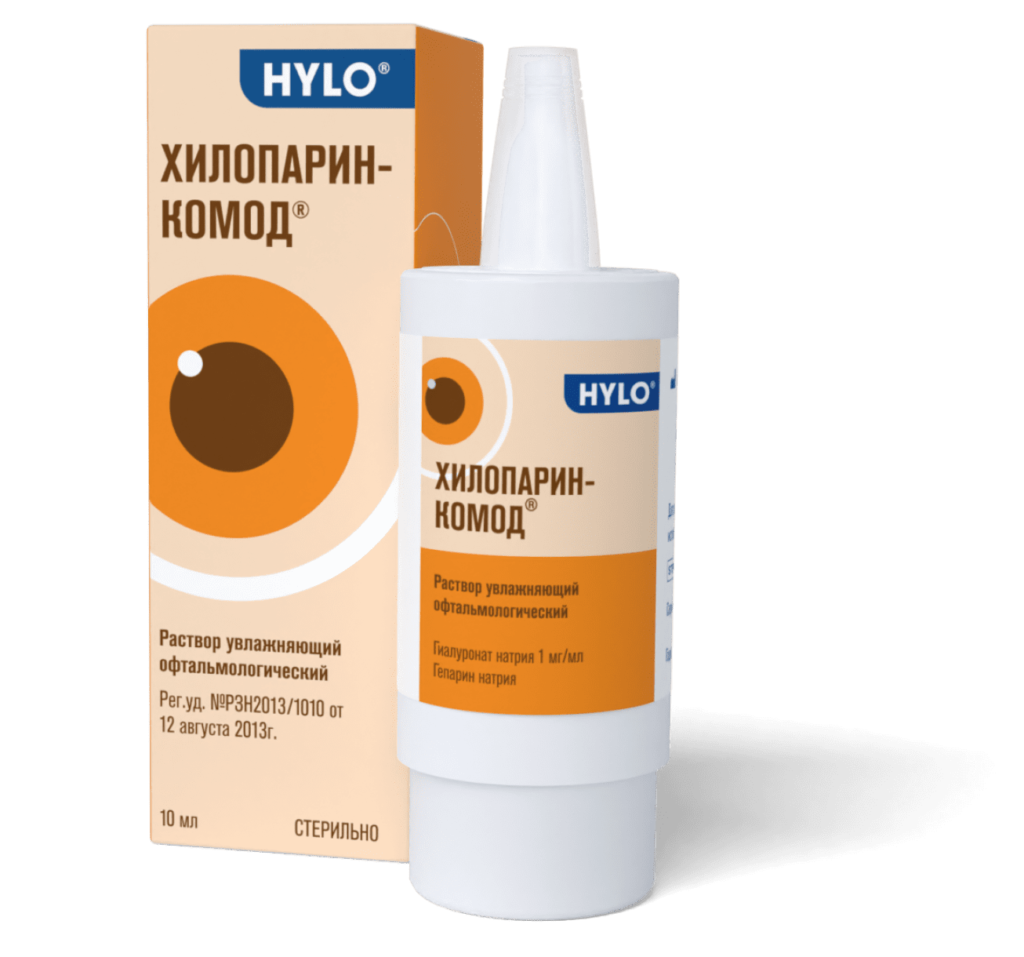 глаза (роговице), за счет чего раствор ХИЛОПАРИН-КОМОД® образует на поверхности роговицы равномерную, сохраняющуюся в течение длительного времени прероговичную слезную пленку, которая не смывается при моргании и не вызывает снижения остроты зрения. Тем самым глаз надолго защищен от ощущения сухости и раздражения, часто